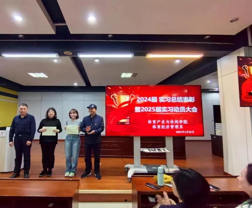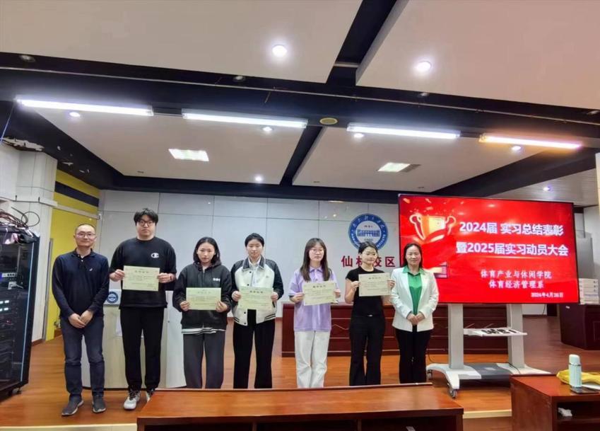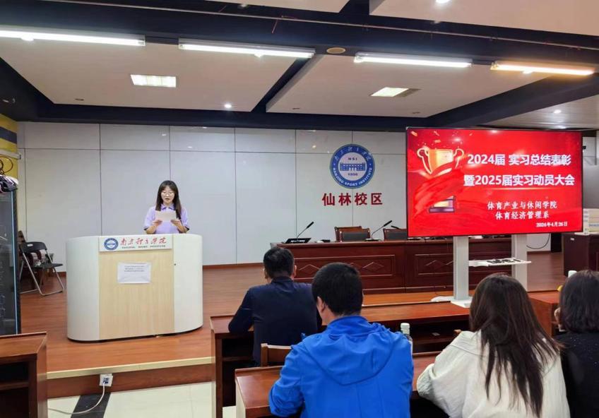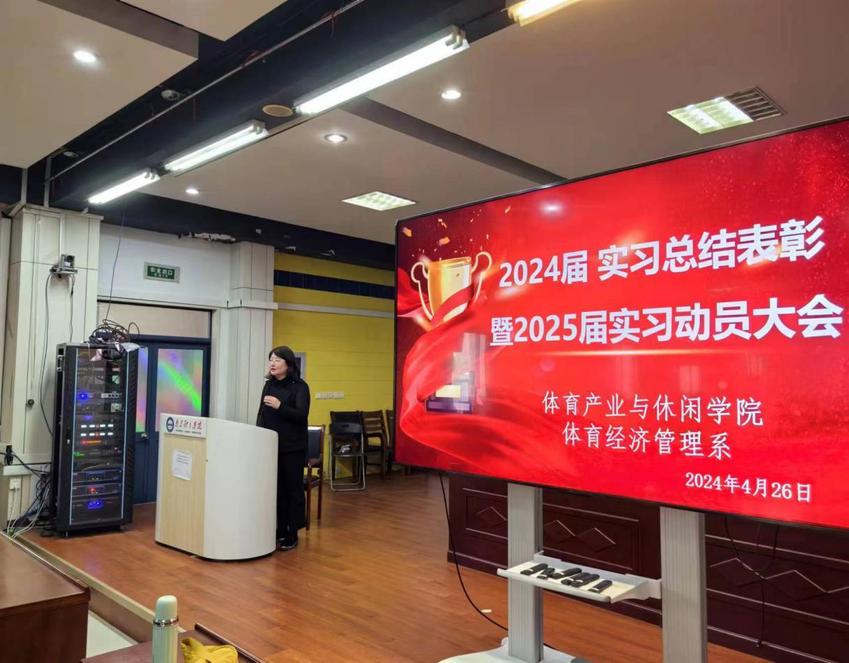 4月26日下午,体育经济与管理系在仙林大学生活动中心召开2024届毕业实习总结表彰暨2025届实习动员大会。体育产业与休闲学院党总支书记王进,体育经济与管理系系主任张建明,副主任孙绪芹、王杉及全体教师出席表彰大会,会议由系副主任王杉主持。
