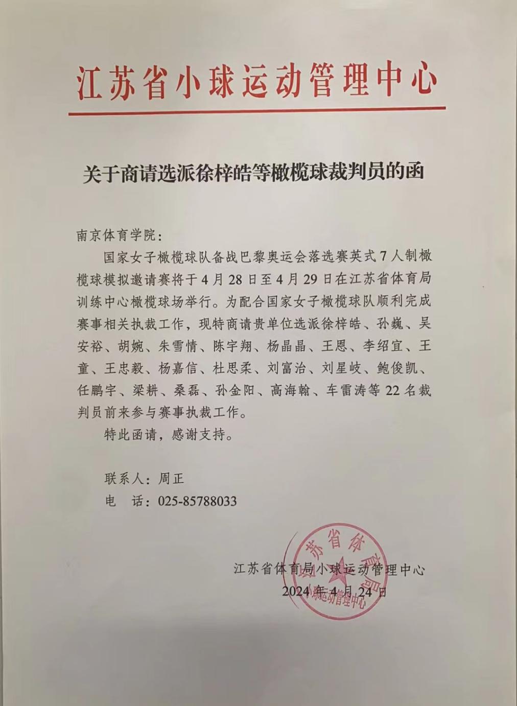 2024年4月28日至29日,江苏省体育局训练中心橄榄球场举行国家女子榄球队备战巴黎奥运会落选赛英式7人制橄榄球模拟赛。本次大赛由江苏省体育局主办,为配合国家女子橄榄球队顺利完成赛事相关执裁工作,学院派出橄榄球专项学生22名裁判员参与赛事执裁工作。
