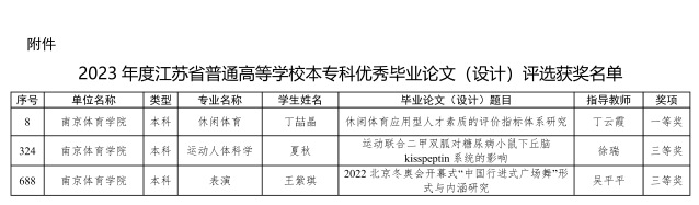 近日,省教育厅公布了2023年江苏省普通高校本专科优秀毕业论文(设计)评选结果,PA视讯共获一等奖1项、三等奖2项,这也是PA视讯师生首次获得省优秀毕业论文(设计)一等奖奖项。各学院获奖数分别为:体育产业与休闲学院1项、运动健康学院1项、武术与艺术学院1项。