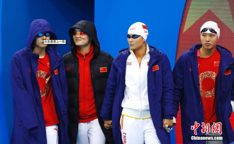 中国队在女子4×100米混合泳接力赛中获得第四,从左到右依次为傅园慧、史婧琳、陆滢、朱梦慧