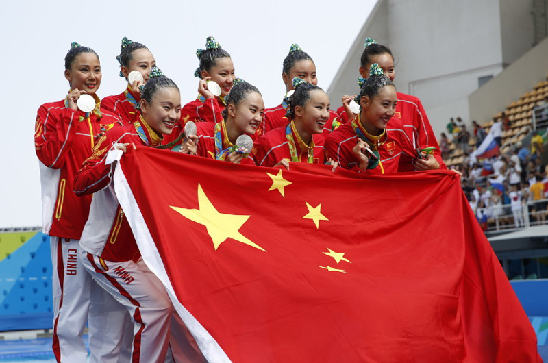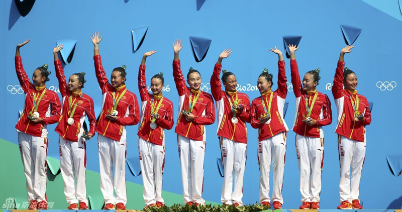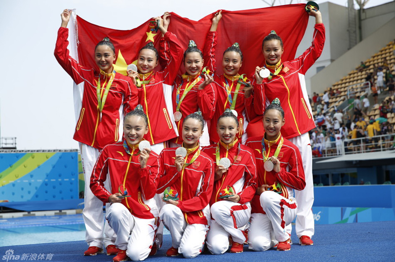 在8月19日晚里约奥运会自由自选比赛中,中国队第7个出场,表现主题为《寻龙》。中国队创意很好,难度极高,较好完成了成套动作,最终得到了97.3667分,完成分29.1000分,艺术印象分39.0667分,难度分29.2000分,总成绩为192.9841分,夺得银牌。