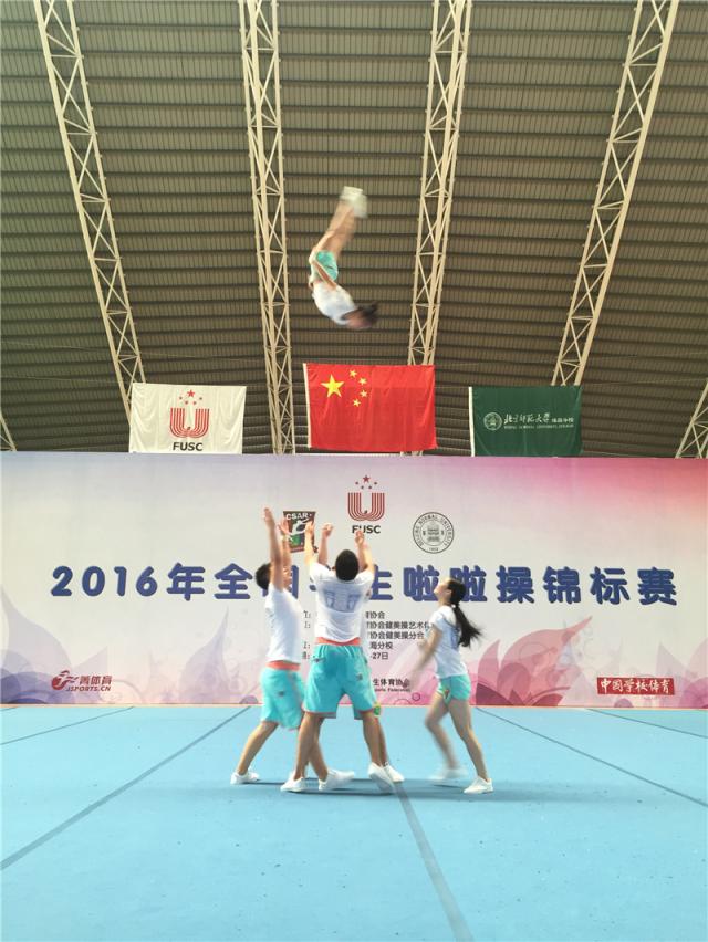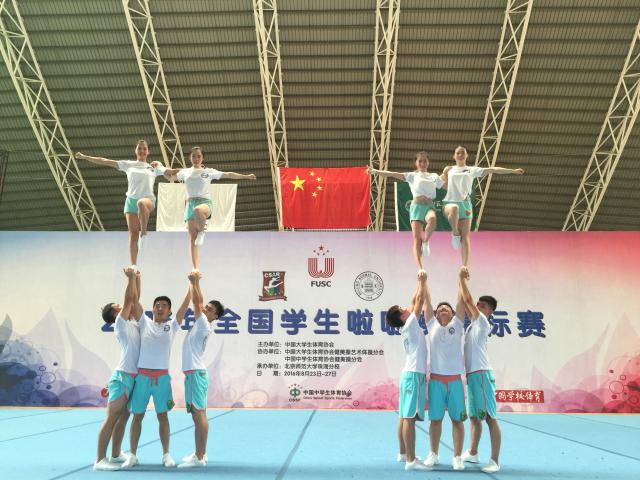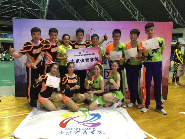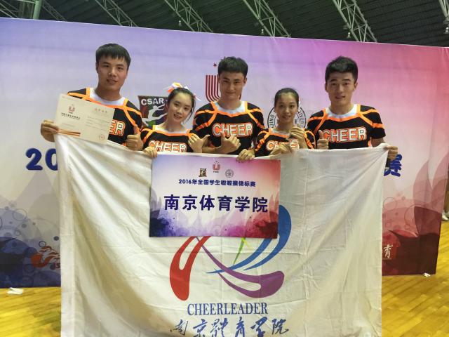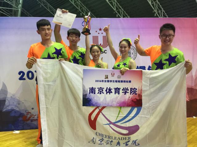 全国学生啦啦操锦标赛是由中国大学生体育协会主办的全国大学生最高级别啦啦操赛事。2016年全国学生啦啦操锦标赛于8月23-27日在北京师范大学珠海分校举行。本次比赛共有来自全国54所学校的一千余名选手参加。我院啦啦操队在小团体技巧项目中,充分发挥暑假集体的训练水平,战胜强劲对手,由韩佳、李颖、吉亮、于帅、张凯组成的南京体院二队获得冠军,由吴玉汝、张心蕙、龙盛博、江志、刘洋组成的南体一队获得亚军,受到现场观众和裁判的一致好评。
