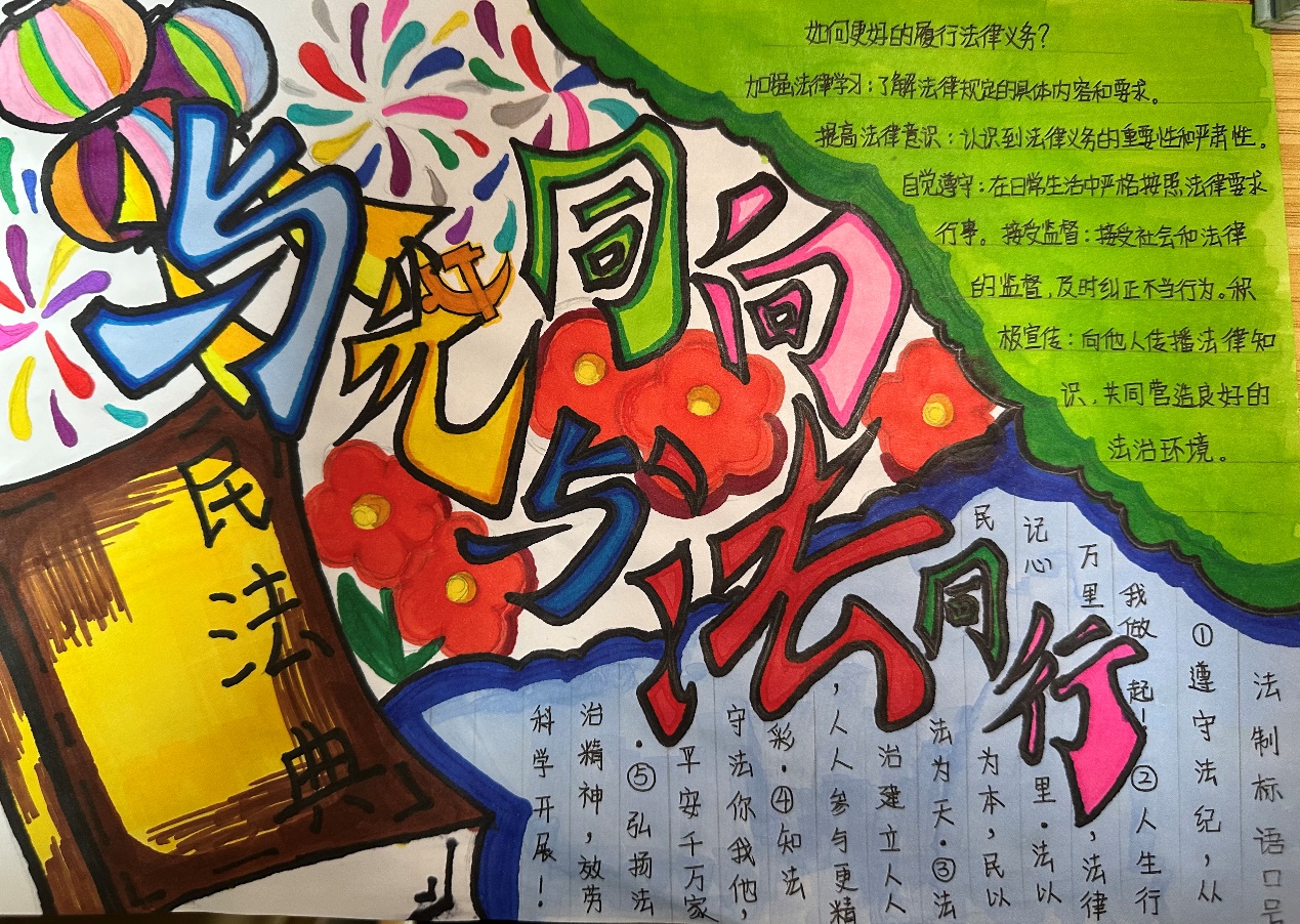 各班通过演讲、手抄报、模拟法庭和黑板报的形式进行法治宣传教育。以学习贯彻习近平法治思想为主线,重点围绕未成年人保护法、预防未成年人犯罪法、网络安全法、生命健康安全等法律法规,将法治教育与青春期教育、心理健康教育、安全自护教育、防欺凌教育等相融合,了解掌握自我保护、防范不法侵害、预防欺凌等知识和技能,不断增强青少年法律知识和法治观念,引导学生学会运用法律手段解决学习、生活中遇到的问题,运用法律武器维护自己的合法权益。