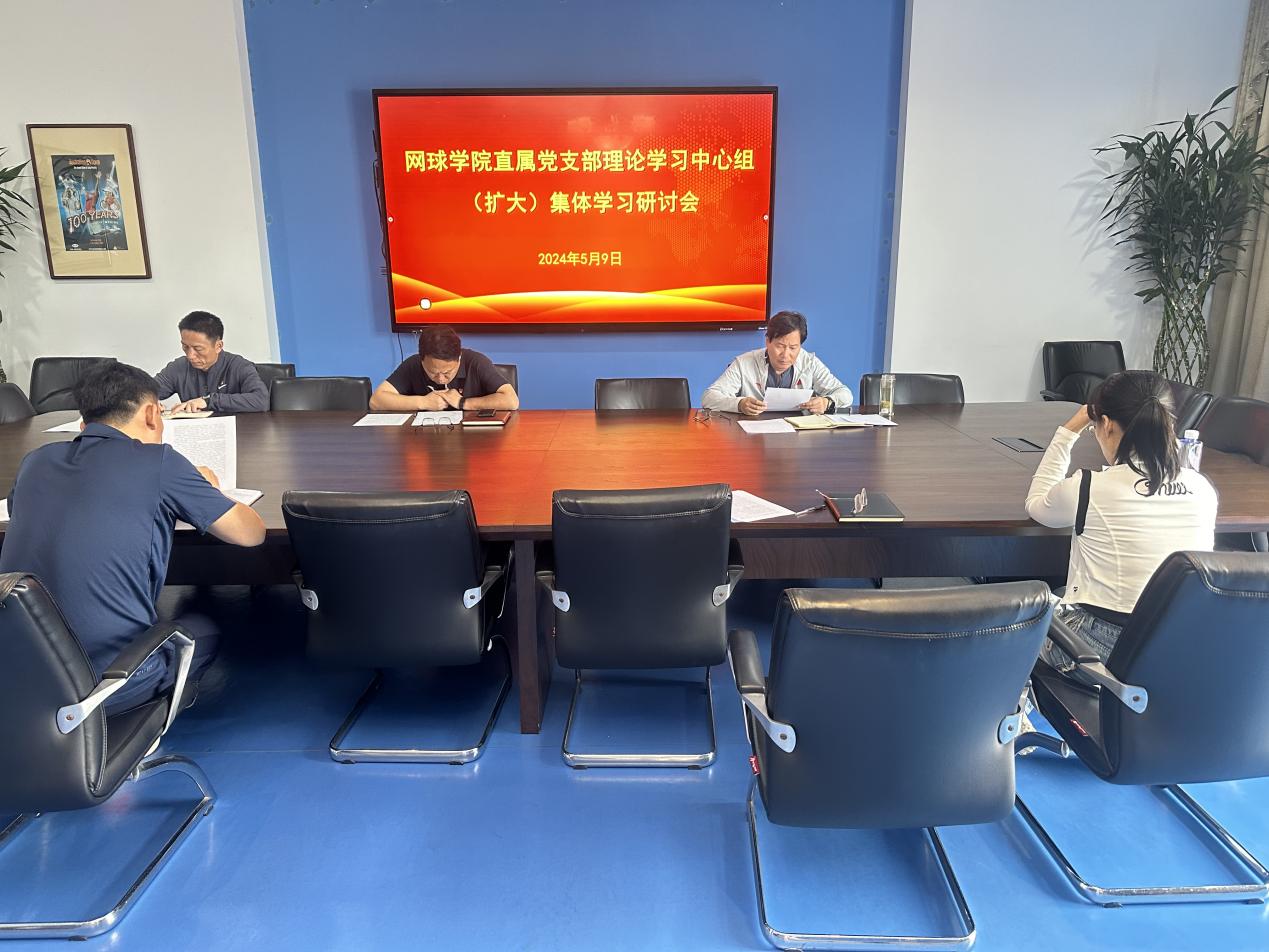 2024年5月9日,网球学院直属党支部开展理论学习中心组(扩大)集体学习研讨会,网球学院直属党支部理论学习中心组全体成员、科级干部、南京钟山网球发展有限公司经理参加会议。会议由网球学院直属党支部书记唐存楼主持。