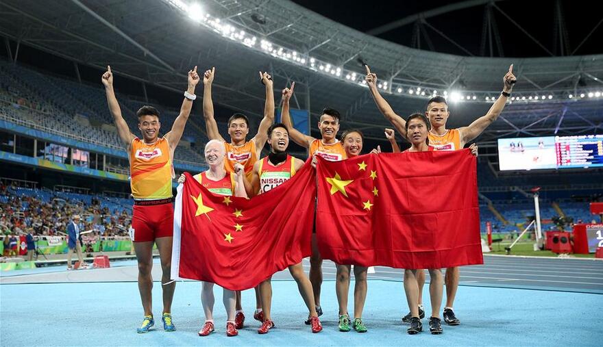 9月14日,在里约残奥会田径女子4x100米T11-13级决赛中,中国队以47秒18的成绩夺得金牌并打破世界纪录。中国队选手沈亚琴、周国华、贾君婷仙、刘翠青(前排从左至右)与领跑员李文、贾登璞、施杨、徐冬林(后排从左至右)在夺冠后庆祝。