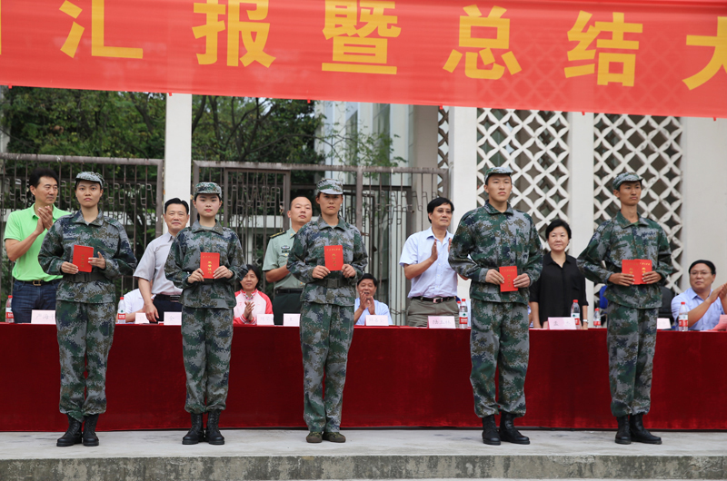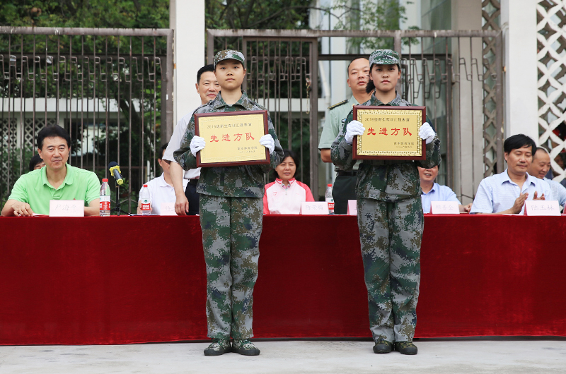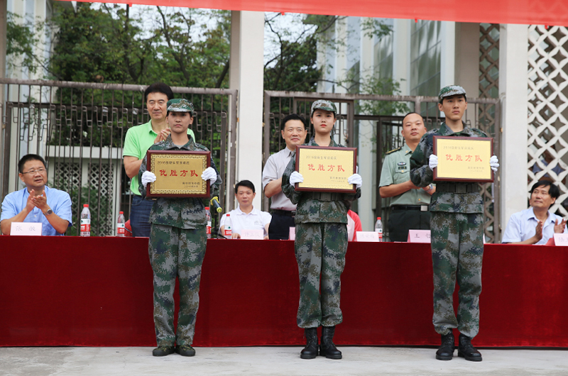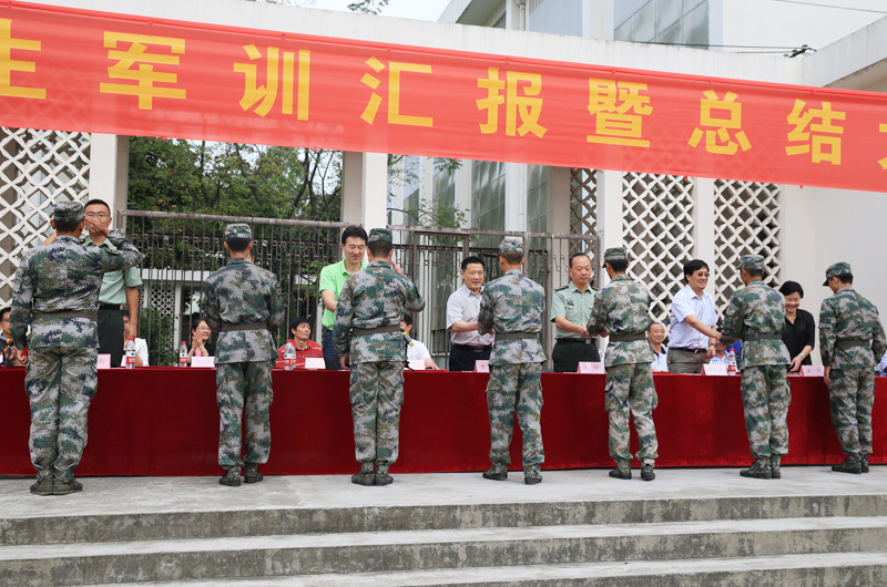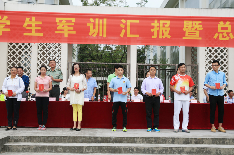 汇报表演结束后,院保卫处副处长、军训工作领导小组副组长、军训大队政委王竹林作军训工作总结,教务处处长严海平宣读《关于表彰2016级新生军训“先进集体”和“先进个人”的决定》和《关于表彰2016级新生军训内务“标兵宿舍”的决定》。大会表彰了军训“优秀学员”代表5人、军训“优秀管理人员”7人、军训“优秀教官”代表7人、军训“汇报表演先进方队”2个、军训“阅兵优胜方队”3个。主席前排就座领导为获奖人员颁奖。