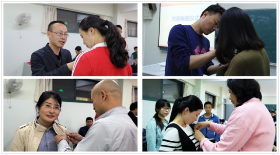 首先,体育系党总支沈鹤军为体育系各基层党支部书记佩戴了党徽,然后由各基层党支部书记为支部每位党员佩戴党徽。随后沈鹤军书记对党徽党旗的由来、特点和内涵进行了专题讲座,并勉励所有党员要“戴党徽,强意识;树形象,甘奉献;做表率,当先锋。”