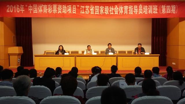 10月11日8时30分,2016年“中国体育彩票资助项目”江苏省国家级社会体育指导员培训班(第四期)开班仪式在院报告厅举行。院党委书记陈国祥教授、知名专家王正伦教授、继续教育部主任李勇勤教授、继续教育部副主任李英及全体工作人员和来自徐州、常州、连云港、盐城、镇江五市的近100位学员出席了开班仪式。开班仪式由继续教育部主任李勇勤教授主持。