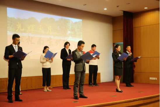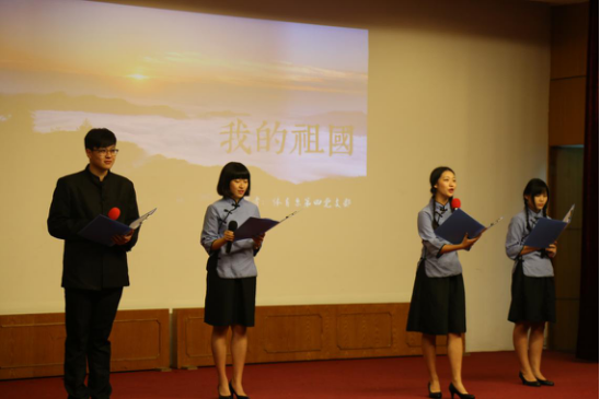 诗歌朗诵会在第一支党支部朗诵的《党旗忠魂颂师情》、《长征诵南体情》拉开序幕。这两首诗歌由体育系师生自己创作,质朴真诚,表达了师生们对党忠诚,对教师职业的热爱。老师们用铿锵激昂的声音,饱含深情地朗诵深深感染在场的观众。由体育系第二党支部演绎的《鲜红的党旗永不褪色》、《颂歌献给党》将“两学一做”学习教育以语言和艺术的形式表现出来,寓教于乐,使全场洋溢着对党的热爱与赞扬。他们还发挥英语教研室的特色,用流利清晰的英语口语表达了对党的歌颂。“我的祖国,高山巍峨”……第三支部朗诵的《我的中国梦》、《放飞中国梦》铿锵有力,精神饱满,将他们内心深处对祖国深沉的爱,融化在极具韵味和感染力的诗歌语言和肢体动作中。第四党支部朗诵的《我的祖国》、《光辉岁月,献礼南京体院》,时而低沉,时而高亢,展示了南体学子的青春风采和精神面貌,再次使朗诵会掀起高潮。