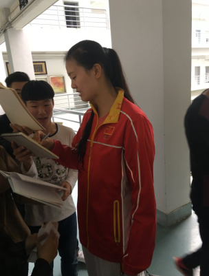 同学们见到了奥运冠军都按耐不住激动的心情,纷纷提问,像“训练很艰苦,如何才能坚持下去?”、“训练比赛遇到困难,如何去排解自己的负面情绪呢?”等等。张常宁很有耐心地一一回答了大家的问题,她认为训练很辛苦,还要克服伤病,但一旦有了目标,就要为目标坚持不懈的努力;遇到困难可以找教练、队友交流沟通,并在业余时间放松自己,做一些自己喜欢的事情来排解负面情绪。