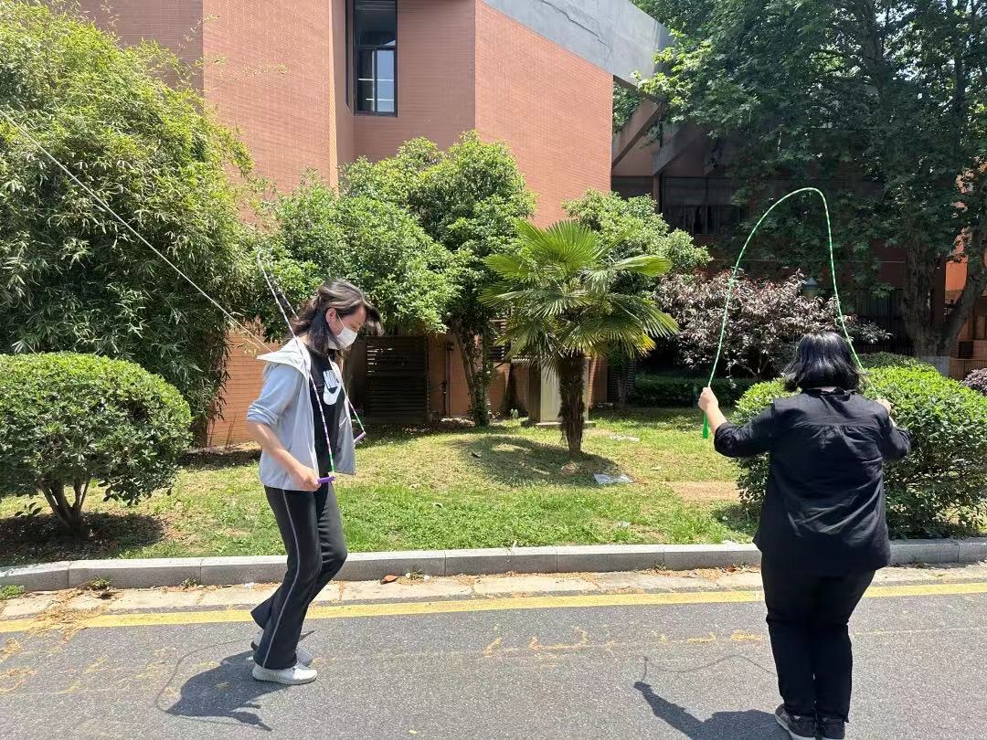 测算BMI、一分钟跳绳、制作毛巾小熊也吸引师生驻足尝试,现场气氛踊跃。最后,运动康复医院和外院医护人员开展了八段锦集体演练,把现场气氛推向高潮。