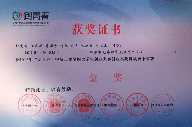 11月16日至19日,由团中央、教育部、中国科协、全国学联等共同主办的2016年“创青春”全国大学生创业大赛总决赛在成都电子科技大学举行,团中央书记处第一书记秦宜智,四川省委副书记、省长尹力出席并讲话。参加国赛总决赛的220所高校399个项目,是从全国2200余所院校的11万个创业项目中历经层层选拔而由各省市择优推荐的。我院大学生参赛的创业项目《江苏赛克林体育发展有限公司》荣获金奖。