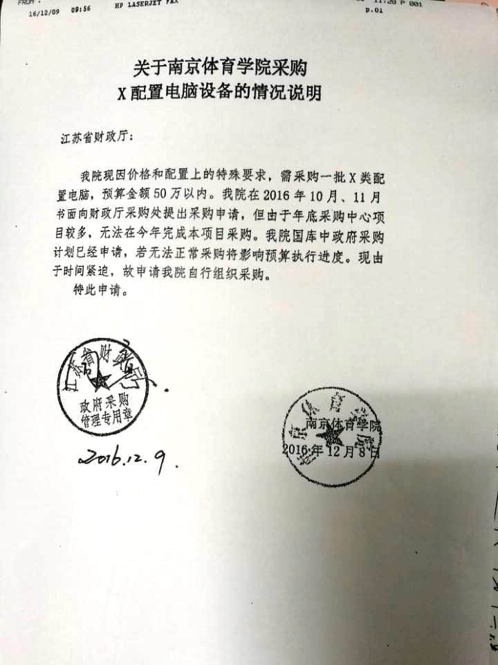 我院现需采购一批X配置电脑,预算金额50万元以内,已在2016年11月书面向财政厅采购处提出采购申请,但由于年底采购中心项目较多,无法在今年完成本项目采购,故于12月9日批复:同意我院自行组织采购。现由于时间紧迫,故决定采取竞争性谈判进行采购。