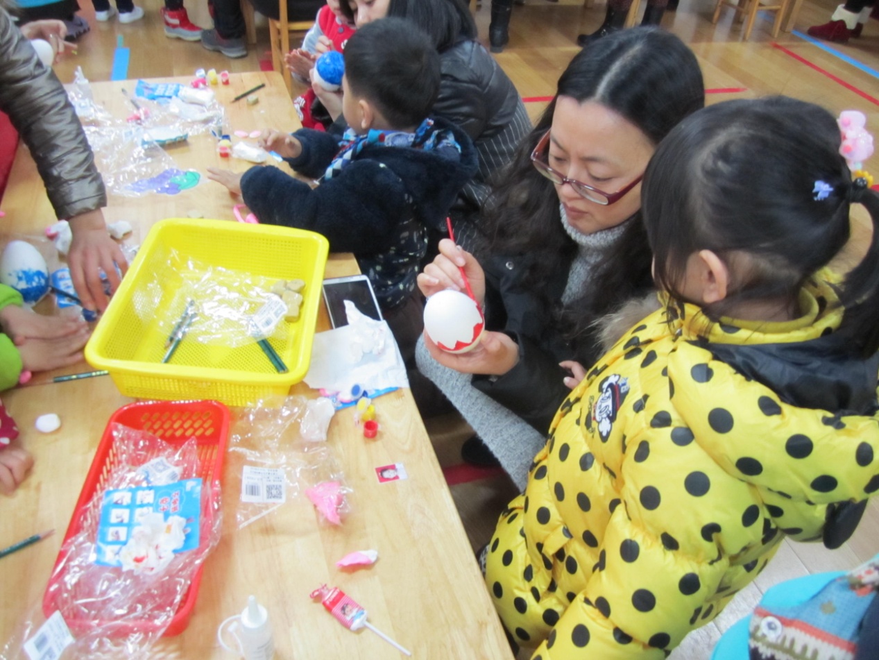 联欢会上,老师、孩子和家长们首先进行了亲子游戏:给爸爸妈妈化妆、吸管接力等。大一班爷爷奶奶带着孩子一起学习国画。班级活动结束后,各个班级师生、家长又共同制作传统美食,孩子们和老师、爸爸妈妈们一起学习包饺子、搓元宵、做冰糖葫芦、剪窗花、做不倒翁……在亲子活动中共享劳动成果。