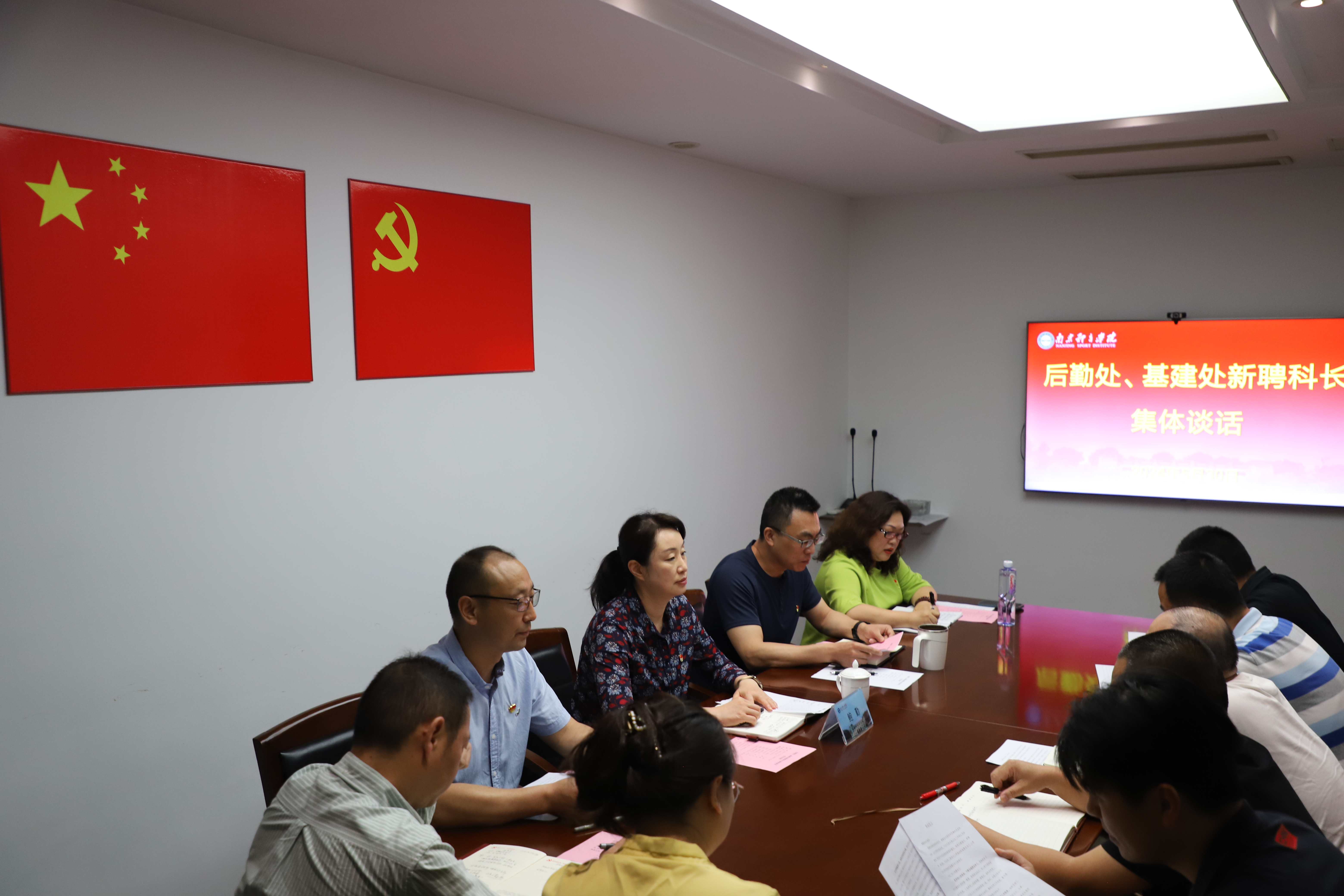 5月30日,后勤处、基建处在会议室召开新聘科长集体谈话会。校党委常委、副校长鲍勤出席并讲话。后勤党总支部书记王寅主持会议,领导班子成员和新聘科长参加会议。