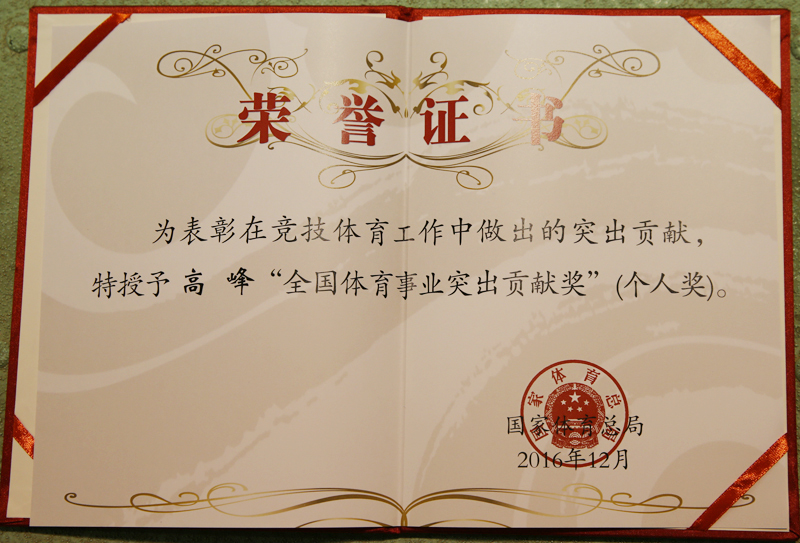 跳水队主教练高峰被授予“全国体育事业突出贡献奖”(个人奖)