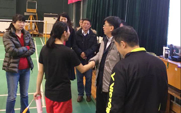 院领导在羽毛球队看望运动员、教练员