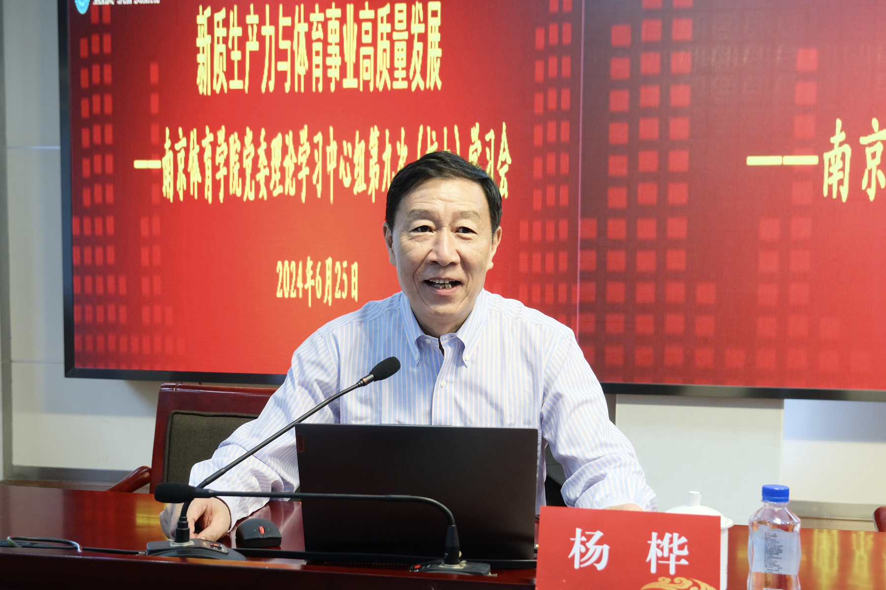 会上,杨桦以《新质生产力推进体育高质量发展的内在逻辑、战略重点与实现路径》为题作专题学习报告。报告以习近平总书记关于发展新质生产力的重要论述开篇,从内在逻辑、战略重点与实践路径三个方面阐述了如何通过发展体育新质生产力推进体育高质量发展。报告指出,体育高质量发展与新质生产力在内涵特征、道路追求和目标指向上高度契合;生产力跃进是推进体育高质量发展的根本动力,形成新质生产力是体育高质量发展的内在要求。要坚持人民至上理念,围绕拓展全民健康新路径、焕发青少年体育新活力、跃升竞技体育新高度、开创体育科技新纪元、展现体育文化新面貌等六大战略重点,以建设体育强国为目标导向,以新型举国体制为根本保障,以科技创新驱动为核心动能,以因地制宜发展为原则方法,以专业人才培养为智力支撑,坚定不移地以新质生产力理论推进体育事业高质量发展,更好地服务于强国建设、民族复兴伟业。整场报告视野宏大、思想深邃、内涵丰富、理实结合,有助于与会人员更加深刻理解和把握新质生产力理论,更加高效推进高水平体育大学建设,充分发挥办学优势为发展新质生产力提供南体智慧和力量,推动学校在建设体育强国和强富美高新江苏的新征程中作出更大贡献。