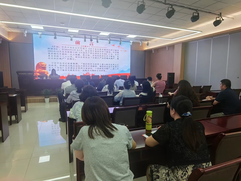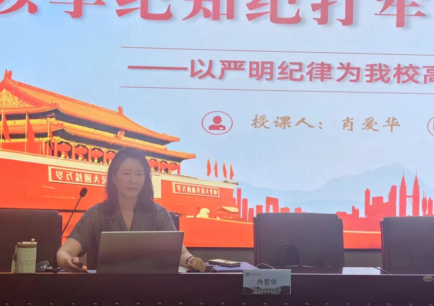 肖爱华从“深学细悟,认识党纪学习教育重大意义;原原本本,吃透《条例》以案明纪;入脑入心,保持政治清醒强化履职担当”三个方面带领全体与会人员深刻把握《条例》核心要义,使大家认识到开展党纪学习教育能够更好解决党纪“不上心”“不了解”“不掌握”突出问题,以守规矩激发硬担当。从高校自身看,以“治党从严”促进“治校从严”“治教从严”“治学从严”三方面,从抓好校风、教风、学风做到三结合,实现高校人员内化于心,外化于行。