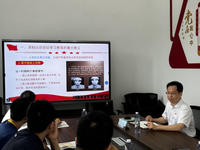 王猛从“深刻认识党纪学习教育的重大意义,原原本本学《条例》、推动《条例》入脑入心,在一言一行中强化履职担当”三个方面带领全体党员深入领会《条例》主旨要义,深刻领悟习近平总书记关于推进党的自我革命、全面加强党的纪律建设重要论述,并通过“以案为鉴、警钟长鸣”的学习内容,详细列举了在“六项纪律”中的反面典型案例,警醒在座的党员干部要谨言慎行、以案明纪。