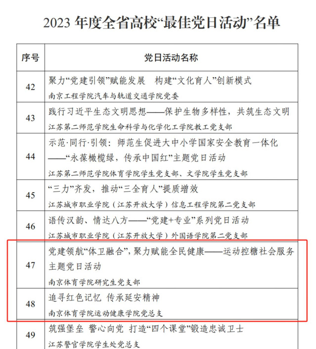 近日,根据《省委教育工委关于公布2023 年度全省高校“最佳党日活动”名单的通知》,PA视讯研究生党支部《党建领航“体卫融合”,聚力赋能全民健康——运动控糖社会服务主题党日活动》、运动健康学院党总支《追寻红色记忆 传承延安精神》荣获2023年度全省高校“最佳党日活动”。