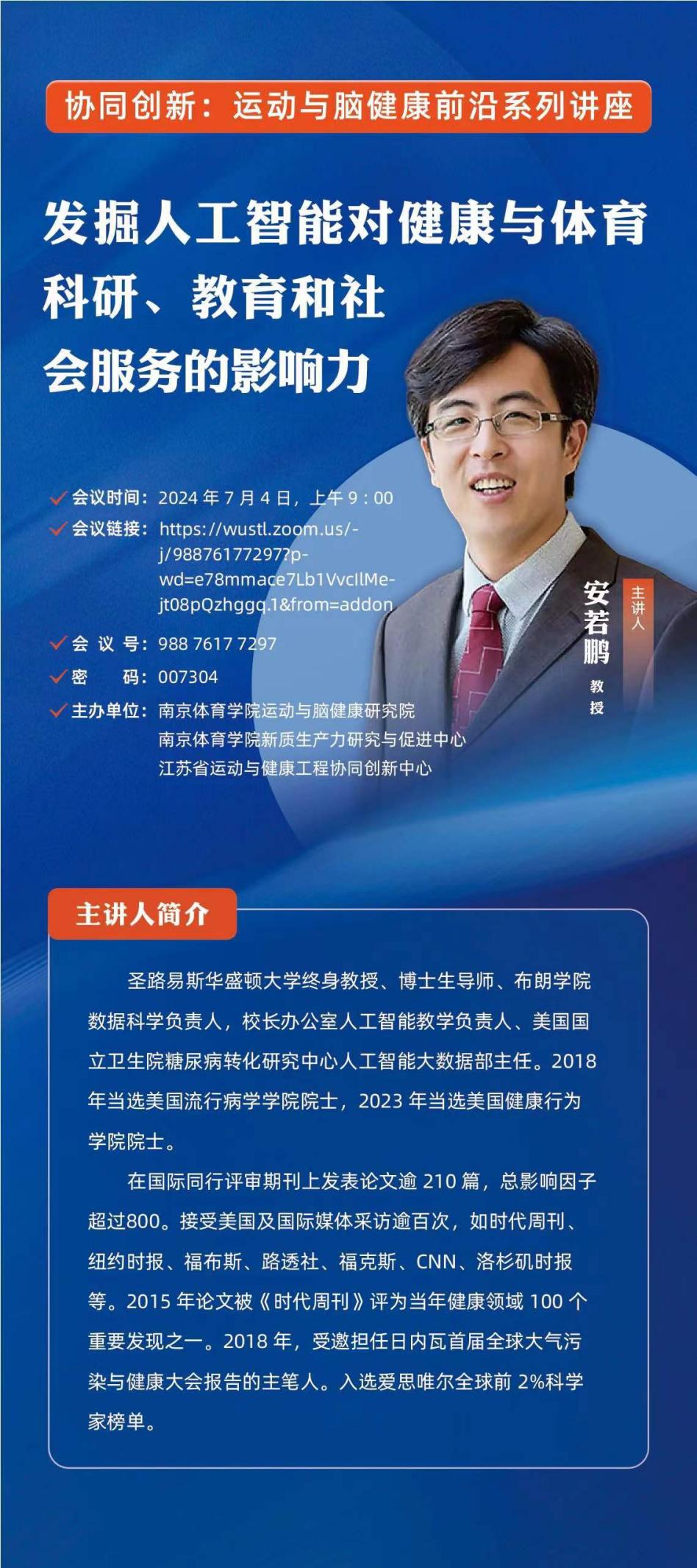 7月4日上午,由校运动与脑健康研究院、校新质生产力研究与促进中心与江苏省运动与健康工程协同创新中心共同举办的“协同创新:运动与脑健康前沿系列讲座”在校行政办公楼301会议室举行。本次讲座邀请到了圣路易斯华盛顿大学布朗学院数据科学负责人校长办公室人工智能教学负责人、美国国立卫生院糖尿病转化研究中心人工智能大数据部主任、博士生导师、安若鹏终身教授主讲。校运动心理学专家沈鹤军教授主持讲座,部分师生参加线上或出席会场聆听。