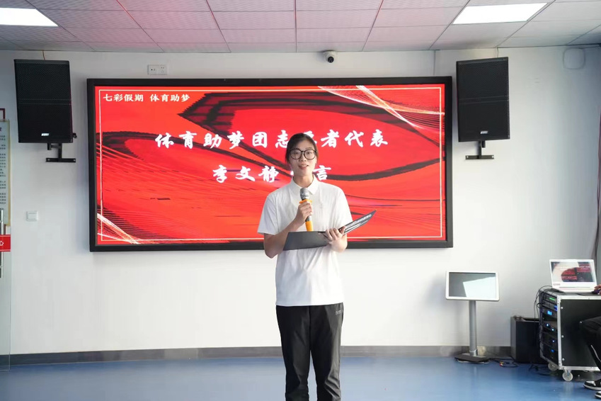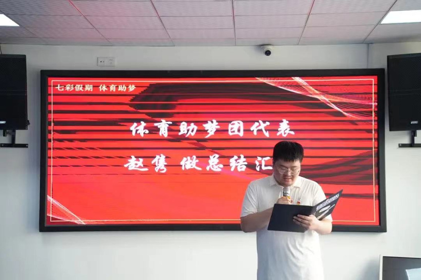 体育助梦团成员赵隽和李文静分别作总结汇报与感悟分享。他表示,在为期9天的志愿服务中,团队成员团队成员们开展体育特色课程教学、素质文化拓展课、乡村田野调查、参观纪念馆等多项活动,以青春之智促进乡村振兴,以青春之力助推体育强国。体育助梦团志愿者代表李文静分享志愿服务实践心得体会,在这短暂而美好的时光里,志愿者老师和孩子们从陌生到熟悉,从拘谨到无话不谈,有太多美好而温馨的回忆,用体育托起孩子们小小的梦想,坚定了青春助梦乡村振兴、乡村教育的信念与担当。
