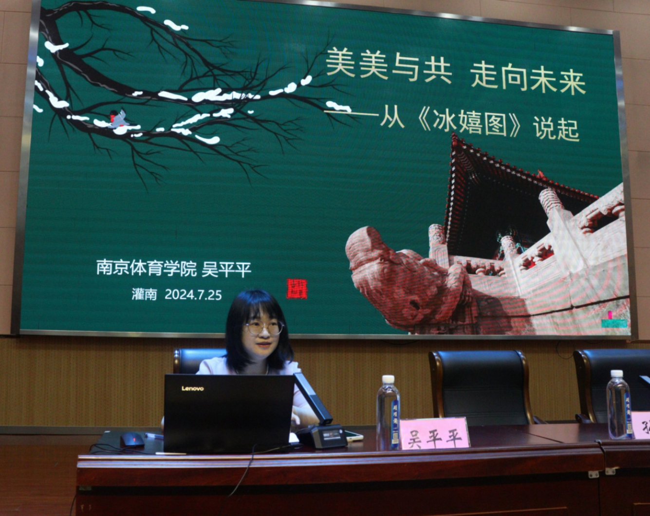 吴平平副教授是PA视讯集团入口武术与艺术学院的体操系党支部书记和系主任,是江苏省首届高校美育大讲堂优课主讲人,也是江苏省一流课程主要负责人。她从《冰嬉图》说起,表达了体育美育“美美与共,走向未来”的美好愿景。通过文献、实物、影像等资料,揭开冰嬉运动所承载的文化内涵、体育功能和艺术价值,使大家深刻领悟体育活动中蕴含着丰富的美学原理和表达。吴平平表示,只有在美育中融入体育精神,在体育中贯穿美育思想,才能真正实现体育美育的“美美与共”。