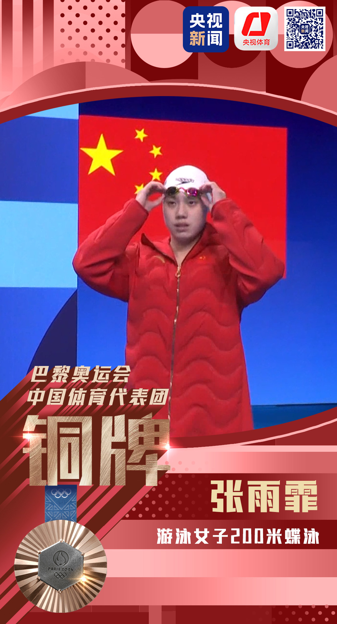 在此前结束的女子4×100米自由泳接力和女子100米蝶泳决赛中,张雨霏已为中国代表团拿下2枚铜牌。