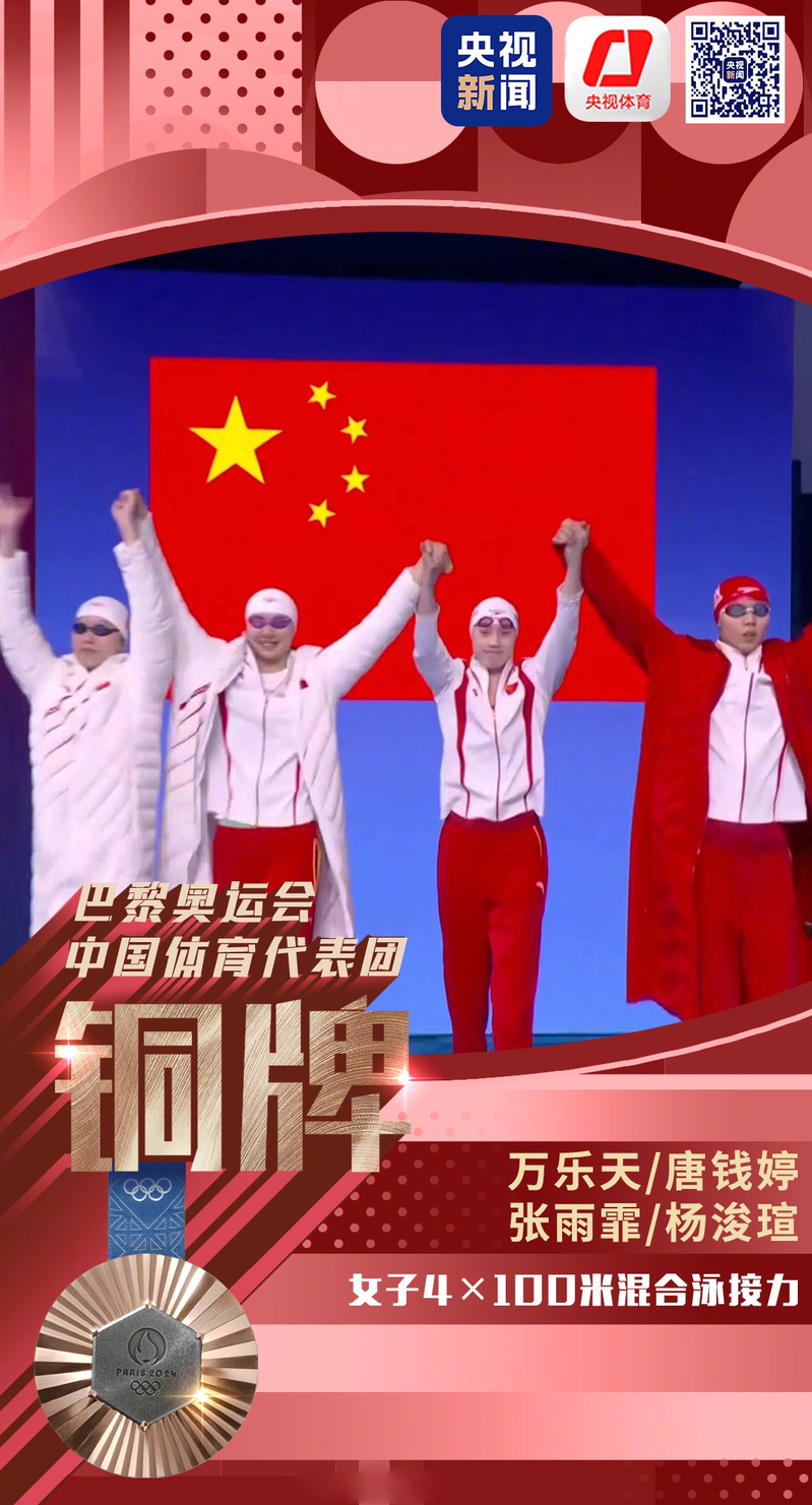 南体运动员张雨霏与队友夺得巴黎奥运会女子4×100米混合泳接力铜牌