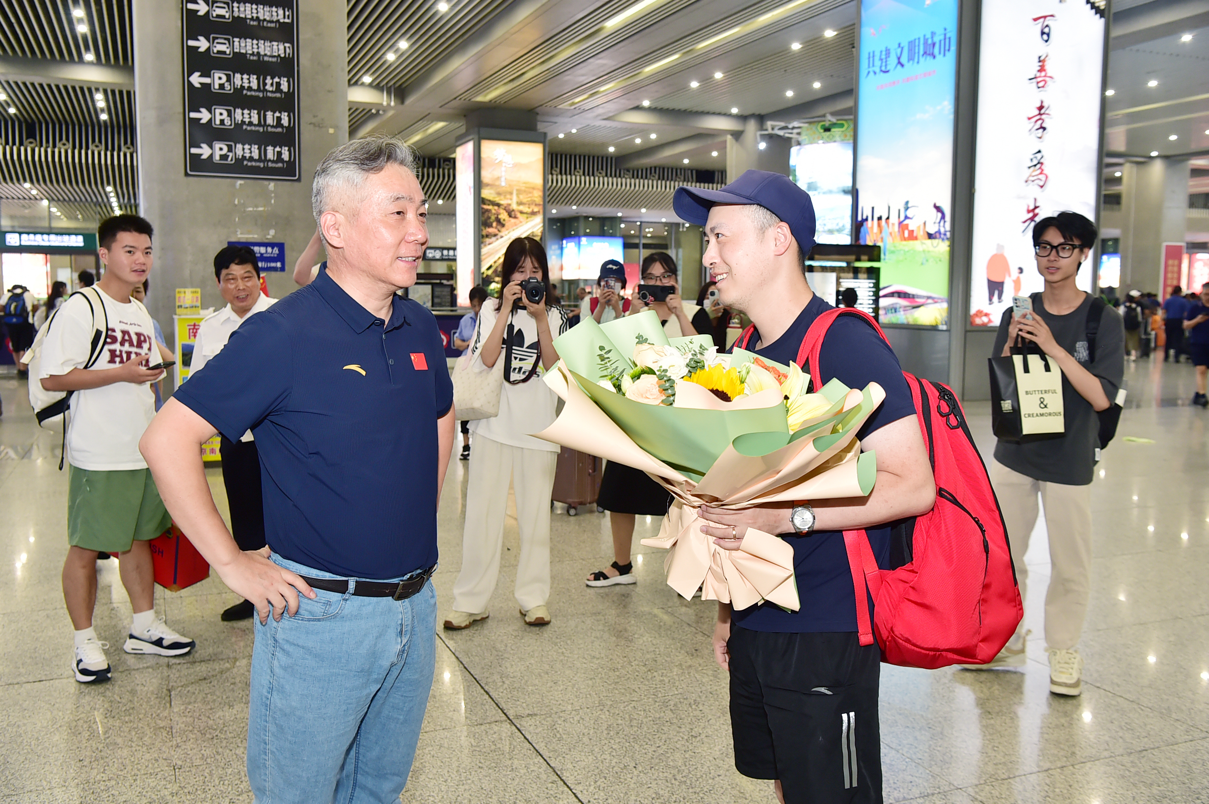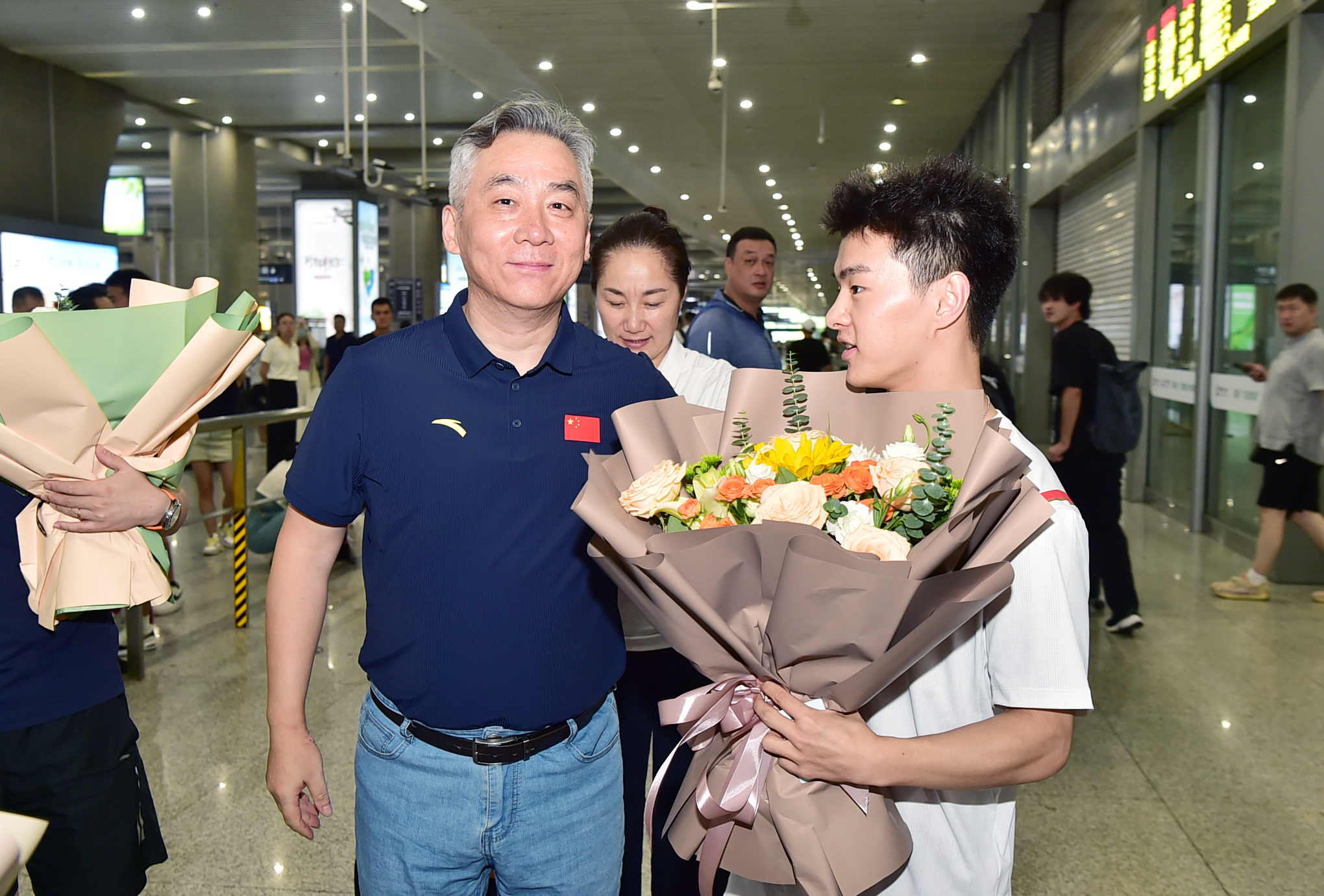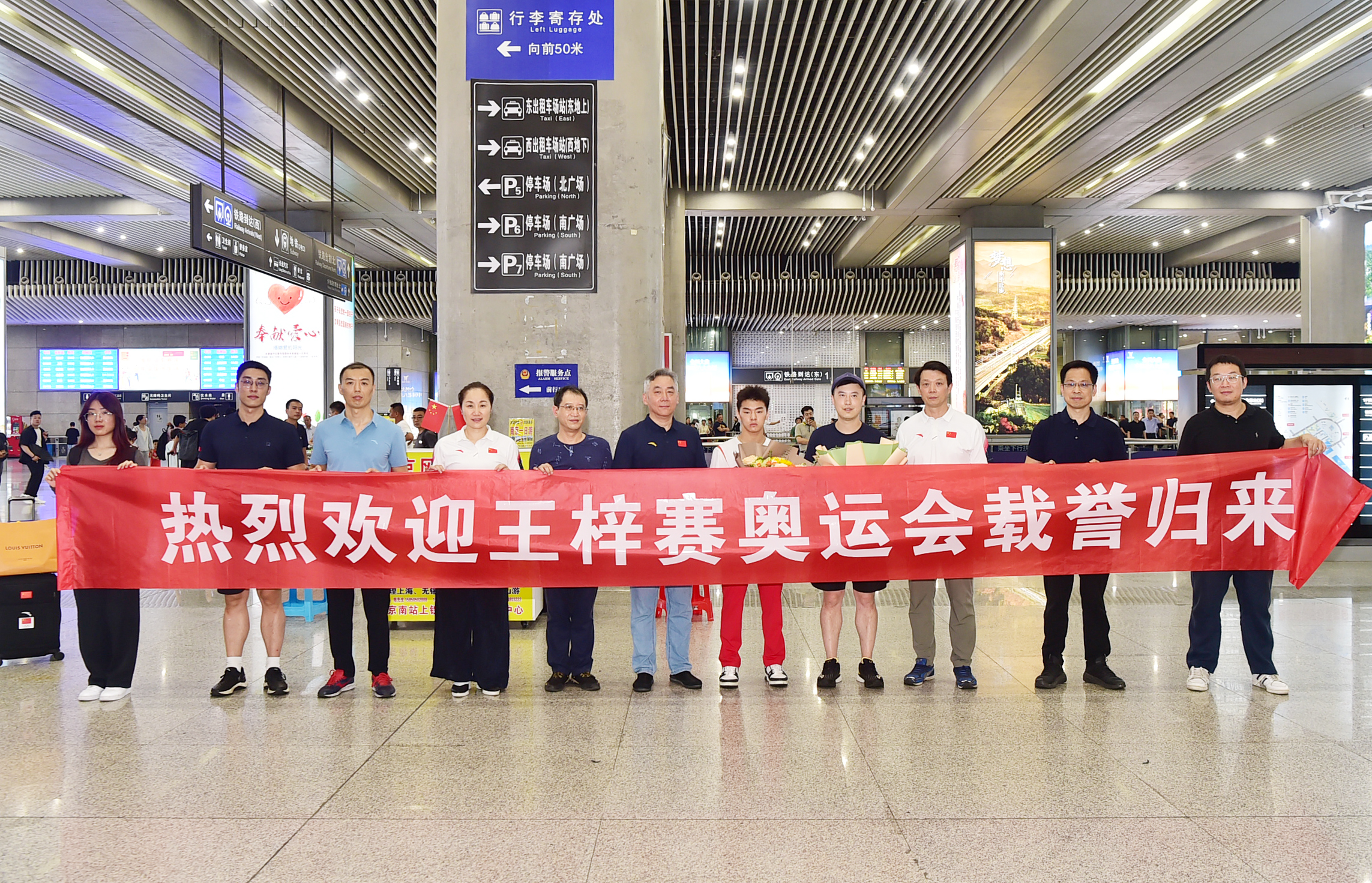 8月6日下午,刚刚在2024年巴黎奥运会蹦床比赛中荣获银牌的王梓赛与教练员胡俊雄返回母校PA视讯集团入口。校党委常委、副校长刘健,党委常委、党委宣传部部长、党委统战部部长许立俊,党委常委、党政办主任王猛,体操学院党总支书记谢长虹、体操学院副院长兼蹦床队领队周丹、训练处副处长叶蓁等到车站迎接。