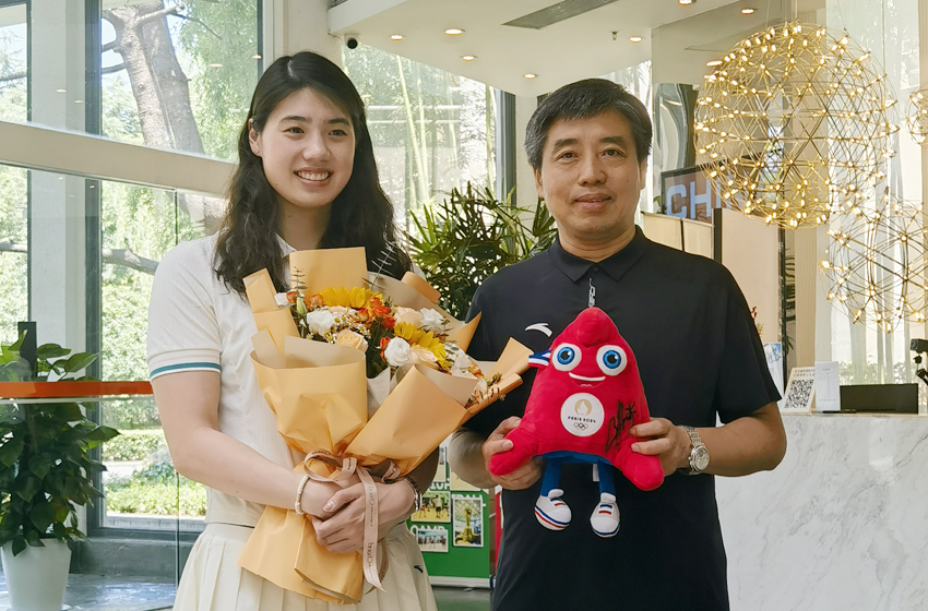 张雨霏向学校领导回赠由她签名的巴黎奥运会吉祥物