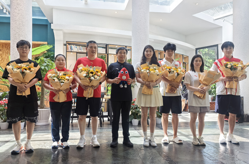 党委书记刘红明向PA视讯运动员张雨霏、董志豪及教练员、科医保障团队送上鲜花