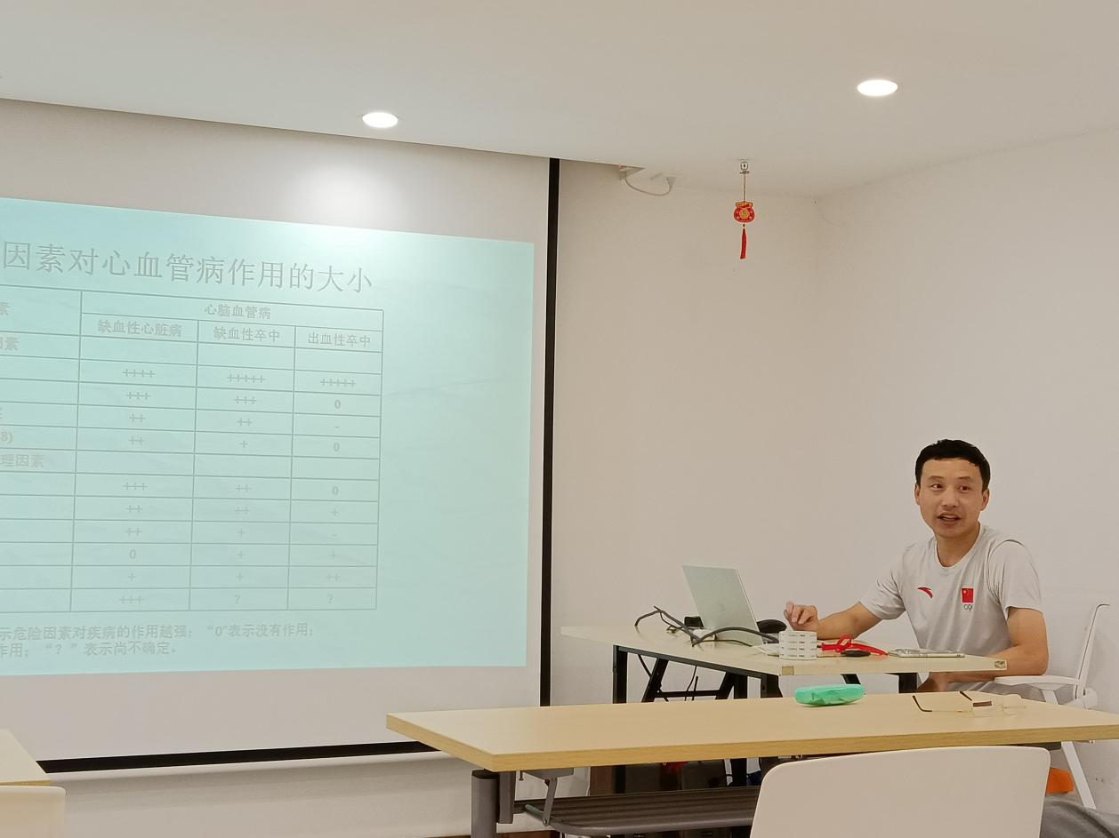 活动中,体能支部书记胡海旭首先进行了“健康生活方式与慢性病预防”讲座,从合理膳食、戒烟限酒、适量运动与心态平衡四方面讲解了预防慢性病的健康生活方式,重点介绍了适量运动的科学方法。
