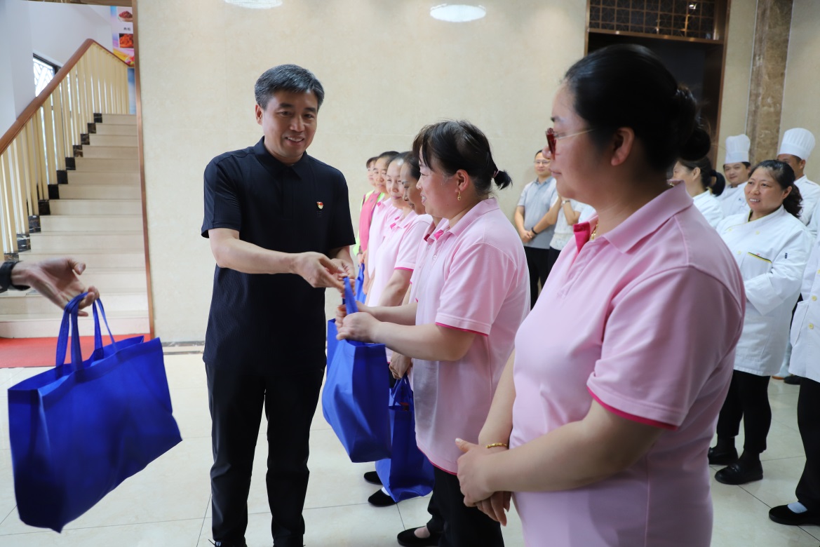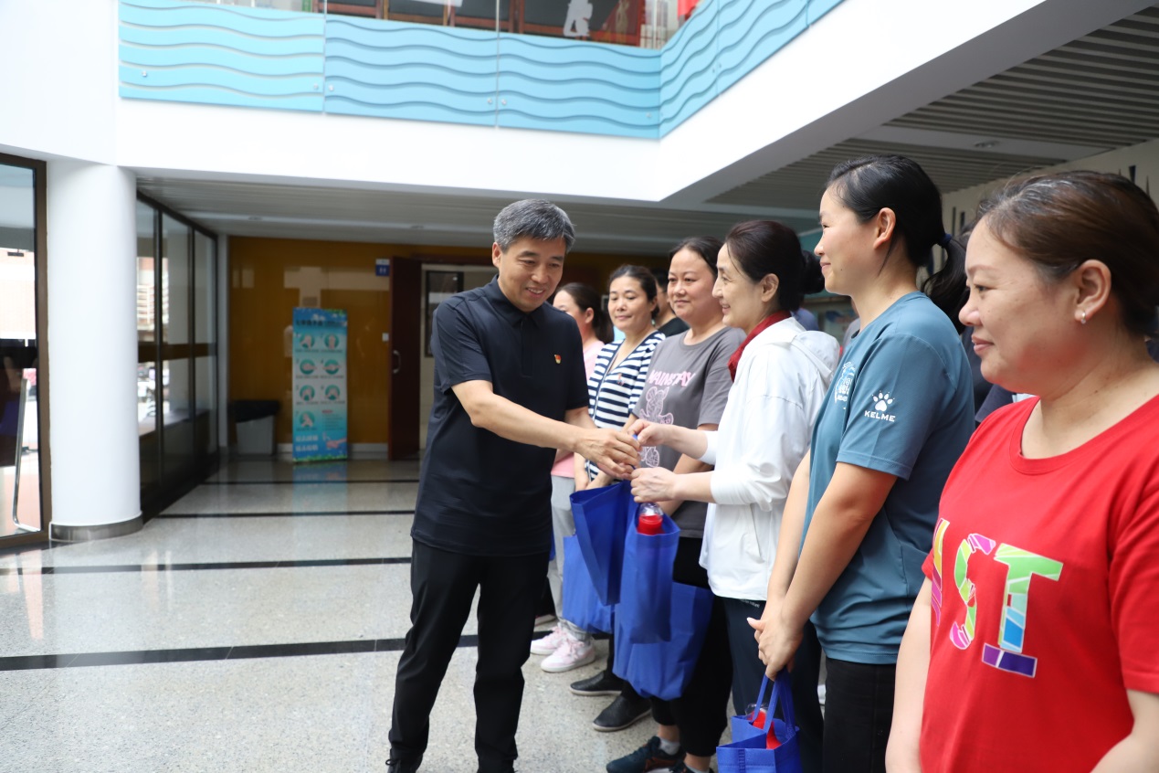 8月14日下午,党委书记刘红明,党委常委、副校长鲍勤一行慰问了暑期坚守岗位的后勤职工,并为大家送上防暑降温用品和诚挚关怀。