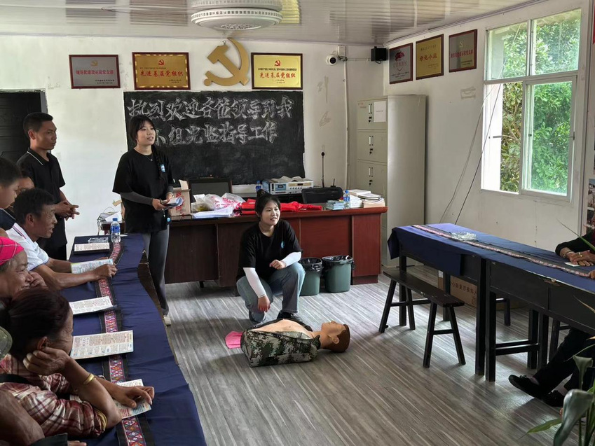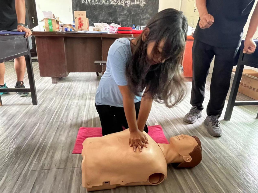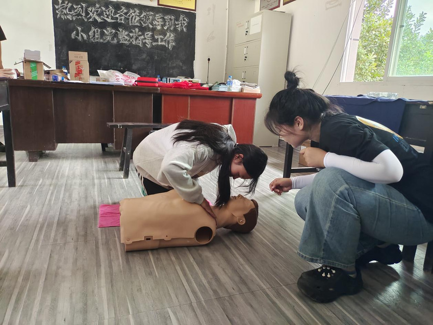 活动伊始,团队队长高文月向当地群众强调了健康对于个人、家庭乃至社会的重要性,并介绍了本次活动的具体内容和意义。活动中,团队成员首先进行了心肺复苏(CPR)教学。通过利用人体模型,详细讲解了心肺复苏的基本步骤和注意事项,并邀请村民上台进行实操练习。在团队成员的耐心指导下,村民们纷纷表示掌握了这项关键技能,为应对突发状况增添了信心。随后团队又开展了海姆利克急救法教学。这一针对异物卡喉的急救方法同样引起了村民们的浓厚兴趣。团队成员通过生动的演示和讲解,让村民们了解到如何在紧急情况下迅速采取有效措施,保护自己和家人的生命安全。