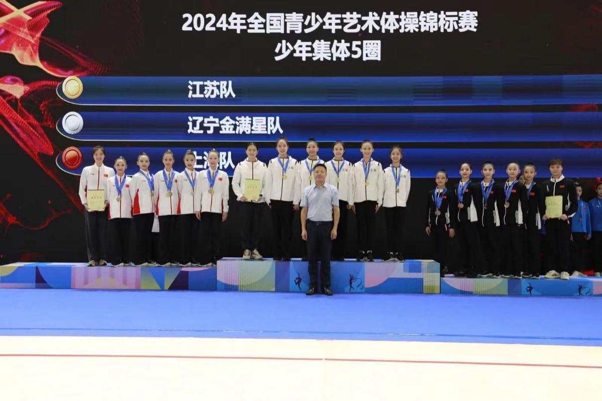 江苏队共派出15名运动员参与全部由专业队选手组成的少年组的多项目比赛。经过激烈角逐,全队收获4金4银3铜的好成绩。尤为值得一提的是,三线一共5人参赛,4人夺冠。最小年龄组少年C组(10岁组)的小将夏芷芮初出茅庐,不畏强手、敢打敢拼,凭借出色的发挥斩获个人全能和个人团体两枚金牌。同组的程若晞发挥同样出色,获得单项球操金牌。此外,少年集体收获单项五圈金牌。