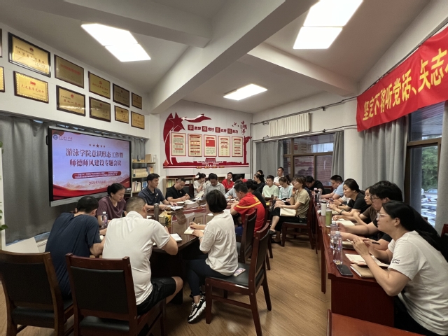 9月11日上午,游泳学院在跳水花游馆二楼会议室召开意识形态工作暨师德师风建设专题会议。会议对学院2024年下半年意识形态工作和师风师德建设作出部署和要求。学院全体教职工参加会议。本次会议由学院党总支书记骆晓娟主持。