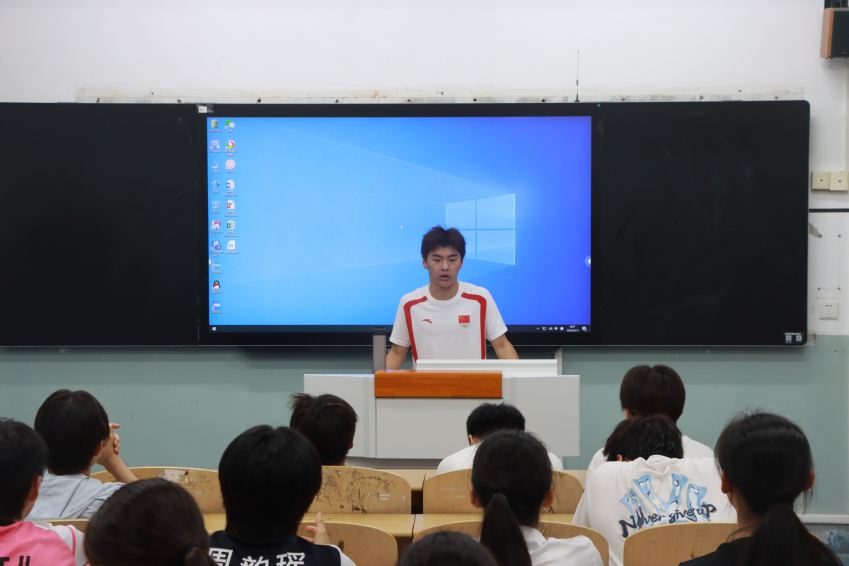 在曾经学习过的课堂上,巴黎奥运会蹦床男子项目银牌获得者王梓赛同学深情地回顾了自己的运动生涯。他从10岁时给自己设定的冠军梦想,到无数次跌倒又爬起的坚持,再到站在世界之巅的辉煌瞬间,每一个细节都饱含深情与汗水。王梓赛特别强调了“坚持与信念”的重要性:“每一个冠军的背后,都是无数次不为人知的努力和挑战。只有坚持自己的梦想,勇敢地面对失败,才能最终站上领奖台。”巴黎奥运会200米自由泳第四名董志豪同学告诉学弟学妹们,遇到困难,不要退缩,如果达不到既定目标,就再来一次,付出肯定会有收获。