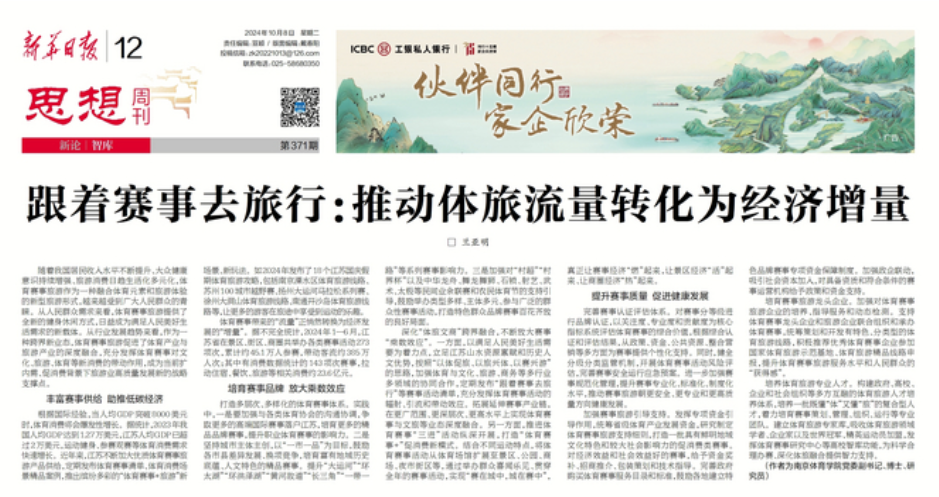 《新华日报》10月8日第12版“思想周刊”头条发表PA视讯党委副书记兰亚明文章《跟着赛事去旅行:推动体旅流量转化为经济增量》。一起来看全文吧!