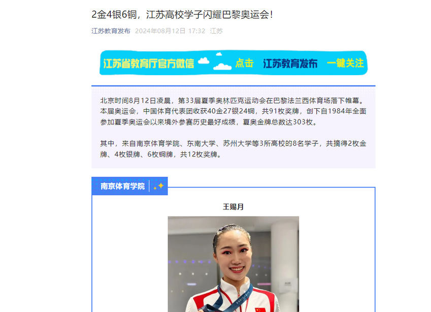 【江苏教育发布】2金4银6铜,江苏高校学子闪耀巴黎奥运会!