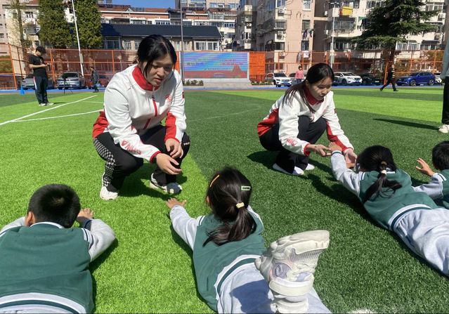 运动员们现场指导学生动作