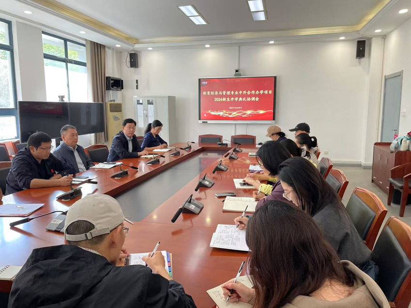 副院长柏景岚介绍了以往体育经济与管理专业中外合作办学项目开学典礼的情况,并对2024级新生开学典礼流程进行梳理、将任务落实到人。她强调,中外合作项目开学典礼是学院近期的主要任务之一,也是对外展示学校形象的重要窗口,务必圆满完成此项工作。