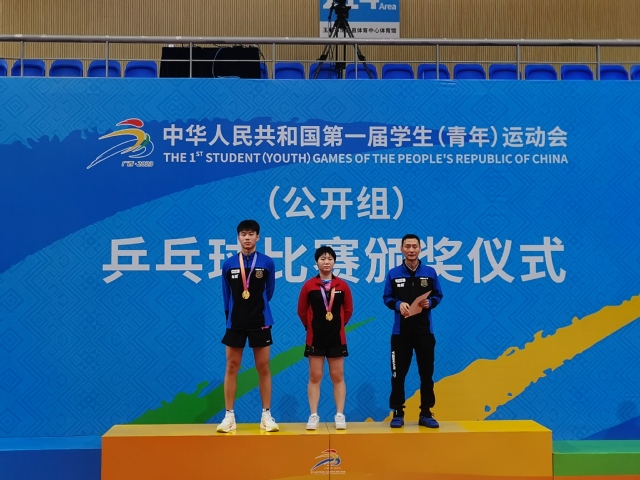 乒羽学院乒乓球队运动员蒯曼/费浚航代表南京市获得学青会(公开组)乒乓球项目混双金牌