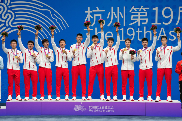 比赛中,中国队在开局大比分0:2落后的情况下,顶住压力、全力以赴、顽强拼搏,连扳3局,最终以3:2实现大逆转,获得亚运会羽毛球男团冠军,实现蝉联。