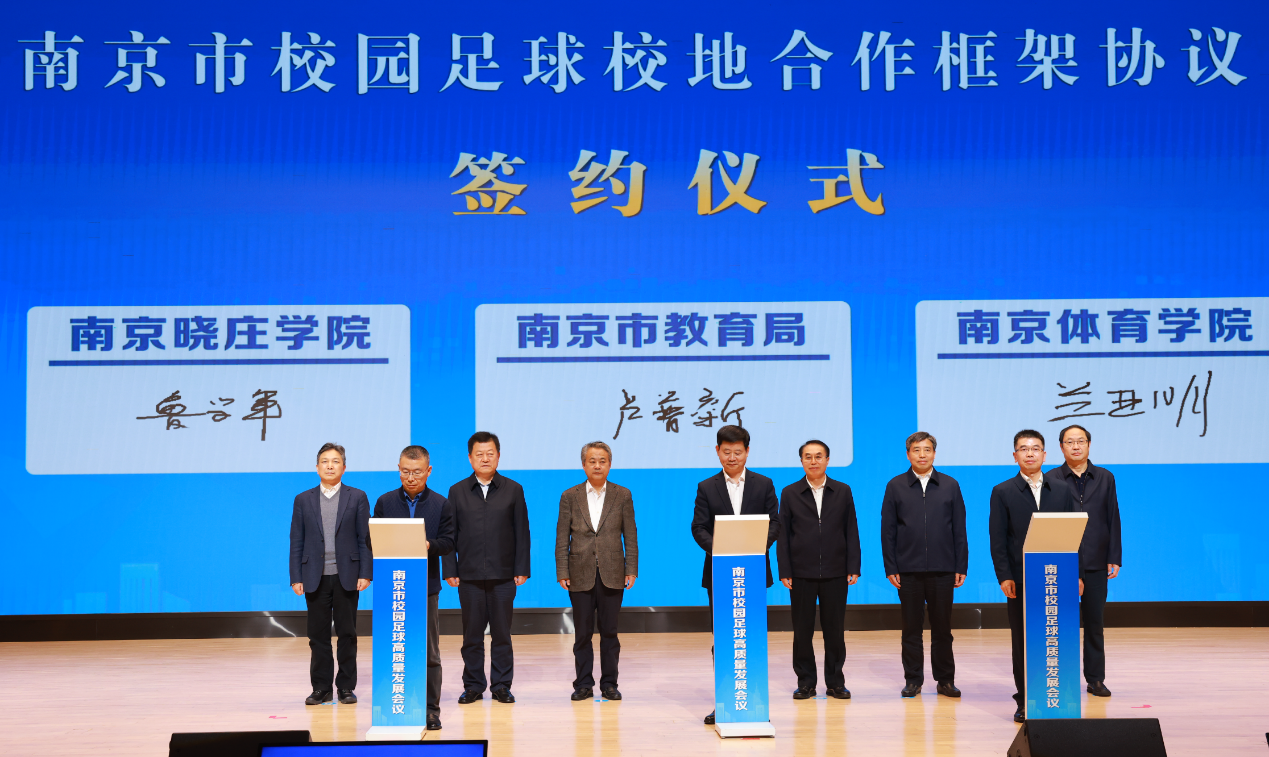 10月28日下午,校党委书记刘红明、党委副书记兰亚明出席在南京师范大学附属中学(奥南校区)召开的“南京市校园足球高质量发展会议”,并与南京市教育局签署校园足球发展合作框架协议。省教育厅二级巡视员李金泉,南京市委常委、宣传部长、市委教育工作领导小组组长陈勇,南京市政府副市长、市委教育工作领导小组副组长孙百军,南京市政府副秘书长戴兴海,南京市委办公厅副主任白清泉,南京市教育局局长、党组书记、市委教育工委书记吴秀亮,南京市体育局局长、党组书记董浩,南京晓庄学院党委书记张策华等领导同志以及南京市委宣传部、市委台办、市委编办、市发改委、市教育局、市财政局、市人社局、市规划和自然资源局、市城管局、市绿化园林局、市外办、市体育局、市红十字会分管负责同志和各区政府分管区长,各区教育局主要负责同志等参与了会议。PA视讯党委常委、党政办主任王猛,党政办副主任杨丽丽,运动训练学院院长赵琦等陪同校领导参与了会议与签约仪式。