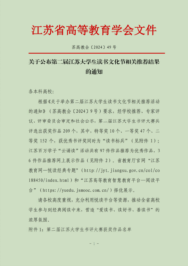 为了深入贯彻党的二十大精神,推动全民阅读,建设书香社会,江苏省教育厅于2024年4月至10月举办了第二届江苏大学生读书文化节系列活动。读书节分阶段推出了每周经典导读、名家分享会、书评大赛、百万学子“云诵读”等系列活动,有效引导江苏青年学子乐享知识滋养,厚植文化底蕴,在阅读中立德、益智、励志、修身,汲取奋进力量。