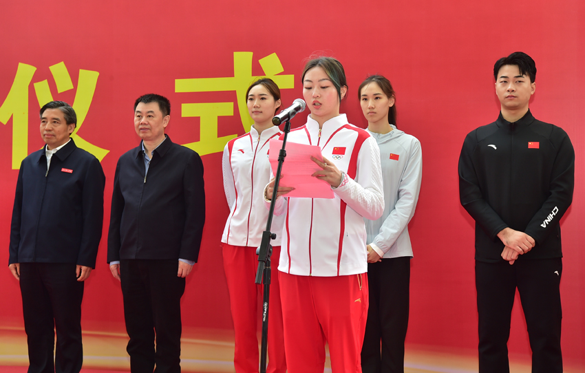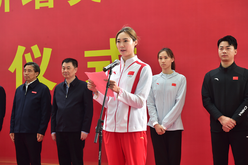 王赐月和郝婷分别在仪式上发言,回顾了她们在2024巴黎奥运会上夺冠的心路历程,感谢省委省政府、省体育局、省教育厅和学校的关心、支持和帮助,表示将在新起点上接续奋斗,努力用更加优异的成绩为国争光、为省添彩。