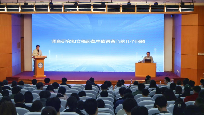 本次讲座以“调查研究和文稿起草中留心的几个问题”为主题。沈德赛围绕如何选题、调研形式、调研顺序、文稿起草四个问题进行交流。首先,在谈到如何选题时,他提出精准选题是调研成功的一半,将上级要求与自己诉求相结合并且领导高度关注的选题才是有效的,并且选题应聚焦具体问题。其次,对于调研形式的探讨,他以40多年前沙洲县各级干部为农民办好事的调查报告为例,论证了团队协作在调研过程中相较于单打独斗的优势。接着,关于调研顺序,沈德赛部分否定了先调再研和先研再调两种常见调研形式,而是以以南京和成都两市市域协调发展历程对比的实践为例,指出调研应该调在研之前,研在调之中,强调调研报告要成为发展的抓手。最后,针对文稿起草如何不落窠臼的典型问题,他提出了解决办法,分别是语言风格鲜活、有图有表有案例支撑、多写多练不怕写,总结成一句话就是“新意+心意+辛意”。课程结束,陆春龙书记代表领导和同学总结,对沈德赛进行真诚致谢,并对同学们给予深切期望,希望同学们能从课程中有所收获,在未来的学习生活中多多参与实践参与调研,并通过书写提升人生高度。