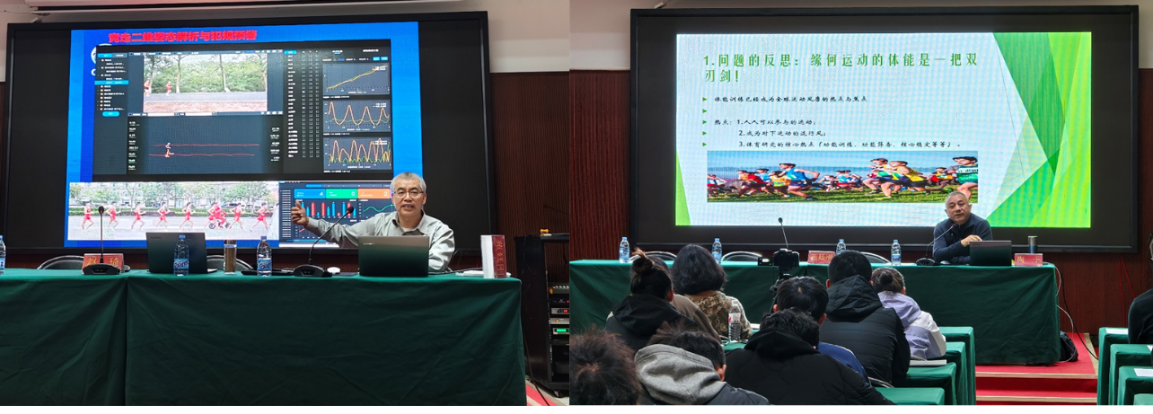 图5苑廷刚研究员讲解穿戴传感器在竞走运动中的应用和陶于教授讲解体能训练中有氧能力和无氧能力的训练误区